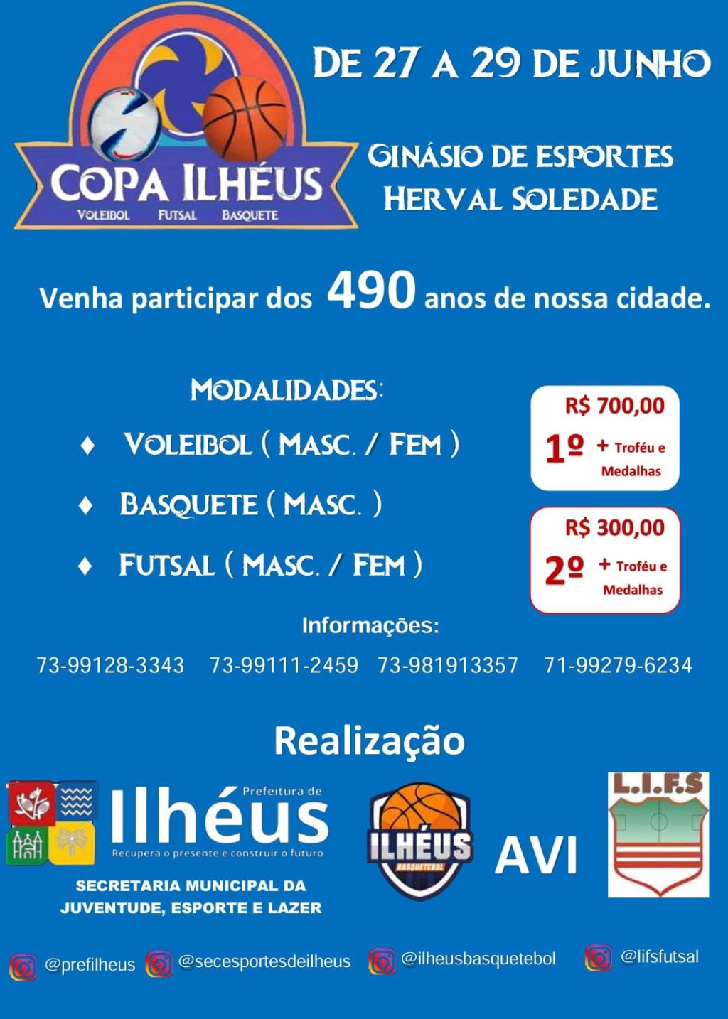 Como parte das comemorações pelos 490 anos de Ilhéus, a Prefeitura, por meio da Secretaria Municipal da Juventude, Esporte e Lazer, realiza entre os dias 27 e 29 de junho a tradicional Copa Ilhéus. O evento acontece no Ginásio de Esportes Herval Soledade e contará com a participação de atletas nas modalidades vôlei, basquete e futsal, nas categorias masculino e feminino.